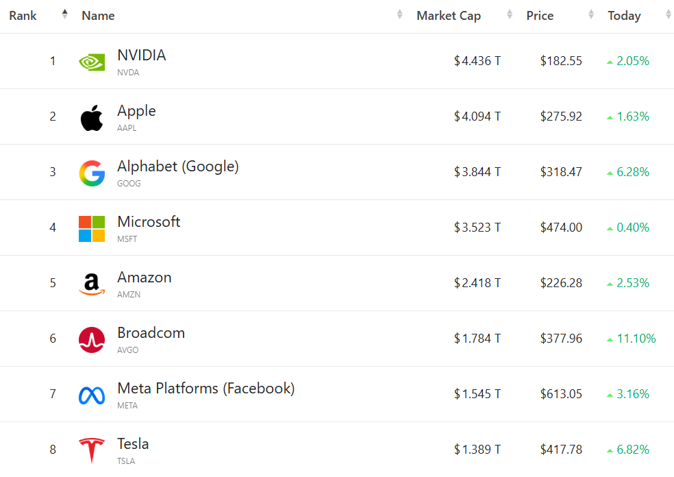 大型科技股集体走高,英伟达涨2.05%,苹果涨1.63%,谷歌C涨6.28%,微软涨0.4%,亚马逊涨2.53%,博通涨11.1%,Meta涨3.16%,特斯拉涨6.82%。