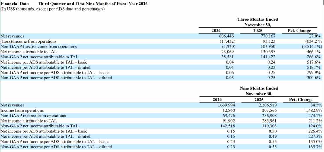 今年1月29日,好未来(TAL.US)披露了其截至去年11月30日的26Q3季度财报。