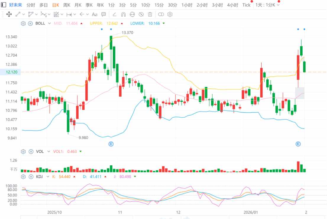 即使在去年12月15日和今年1月12日分别出现了一波冲击BOLL线上轨的走势,但均未观察到明显的成交量放大支持,也没有形成有效实体K线突破,在技术面上属于典型的BOLL线指标“假突破”,后续公司股价依旧在BOLL线中下轨震荡。