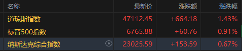 道琼斯指数涨1.43%,报47112.45点;标普500指数涨0.91%,报6765.88点。