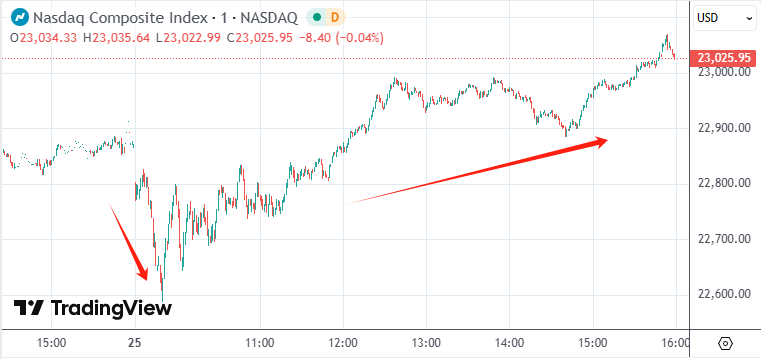 截至收盘,纳斯达克综合指数涨0.67%,报23025.59点,早盘一度跌超1.2%;
