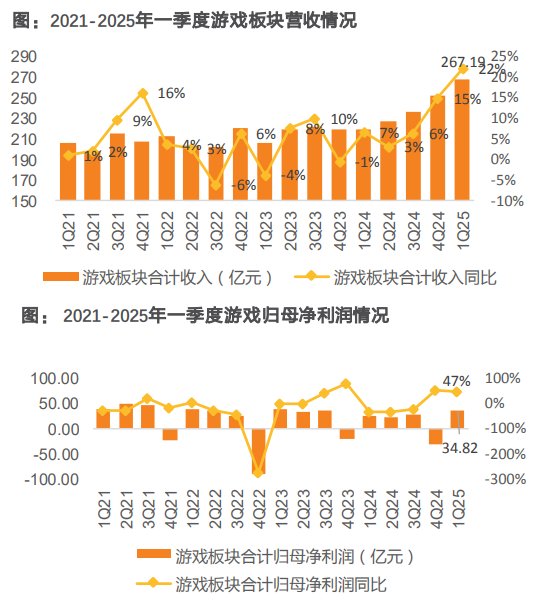 延续了2024年第四季度的高增长趋势,游戏板块于今年一季度继续呈现景气上行趋势,相关上市公司实现营收、净利双双增长,盈利表现整体向好。天风证券数据显示,一季度游戏板块上市公司共实现营收267.19亿元,同比增长22%;实现归母净利润34.82亿元,同比增长47%。