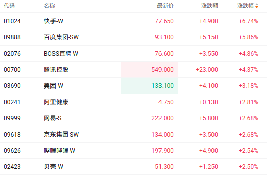受多重利好叠加,港股科技股今日表现强势。截至发稿,快手-W(01024.HK)涨6.74%、百度集团-SW(09888.HK)涨5.86%、腾讯控股(00700.HK)涨4.37%,京东集团-SW(09618.HK)涨2.68%。