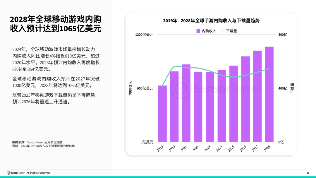 Tower发布《2025年海外游戏市场洞察》。全球移动与PC游戏市场重拾增长势头,合计市场规模预计将在2028年突破1200亿美元。2024年全球移动游戏内购收入同比增长4%,超过2020年水平。2025年将继续增长6%,达到854亿美元。预计2028年全球移动游戏内购收入达到1065亿美元。
