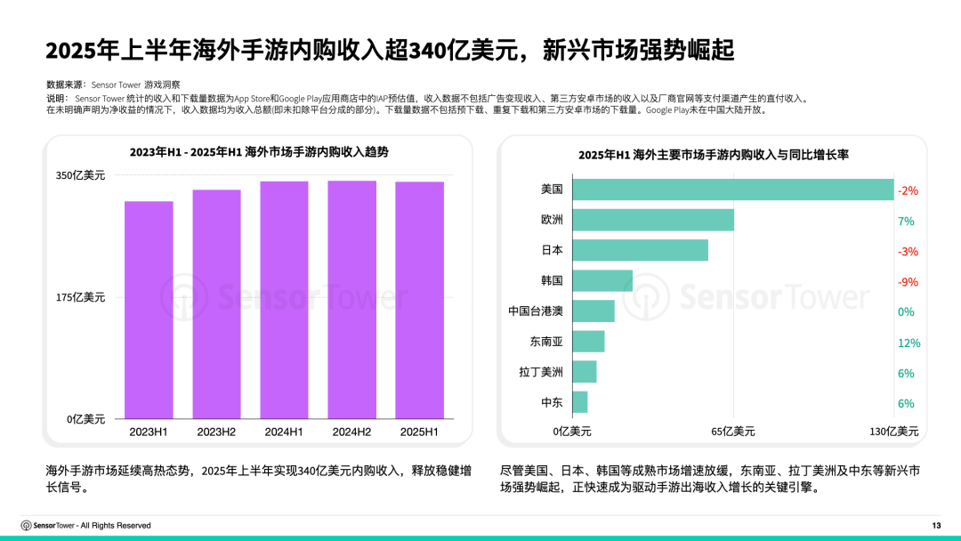 海外手游市场延续高热态势,2025年上半年实现340亿美元内购收入,释放稳健增长信号。尽管美国、日本、韩国等成熟市场增速放缓,东南亚、拉丁美洲及中东等新兴市场强势崛起,正快速成为驱动手游出海收入增长的关键引擎。