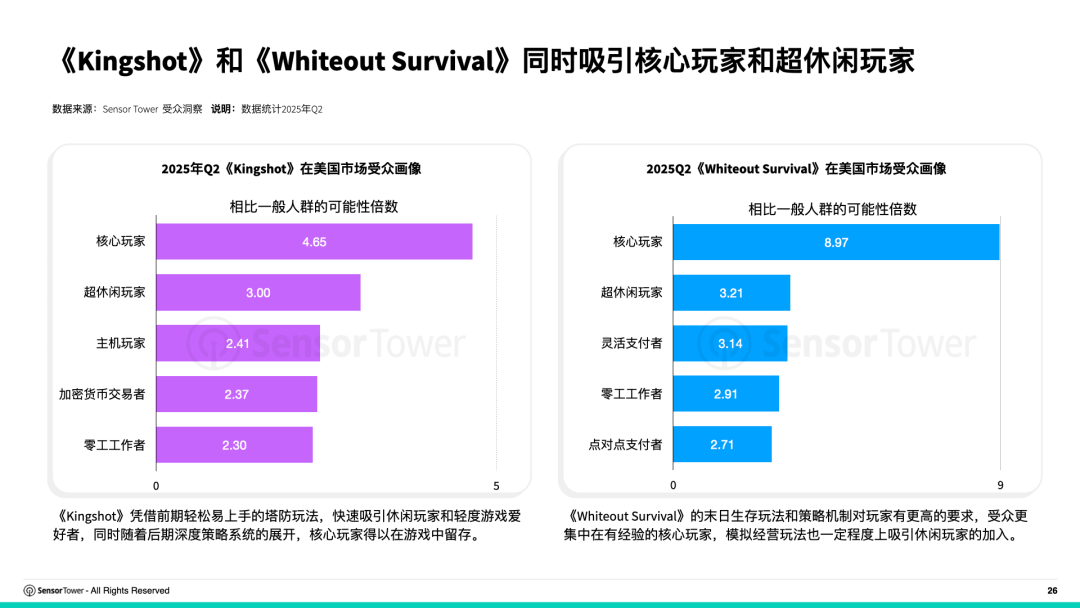 《Kingshot》凭借前期轻松易上手的塔防玩法,快速吸引休闲玩家和轻度游戏爱好者,同时随着后期深度策略系统的展开,留存核心玩家。《Whiteout