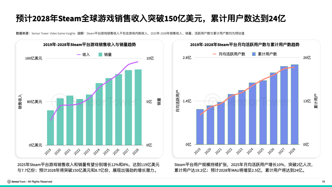 与此同时,自2023年以来,全球PC游戏(Steam)市场也展现出显著增长势头。2024年同比增长22%,2025年将继续提升12%,接近120亿美元。预计2028年全球PC游戏收入将突破150亿美元。
