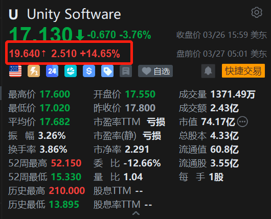美股异动丨Q1业绩超预期指引,游戏引擎巨头Unity Software盘前涨14.65%