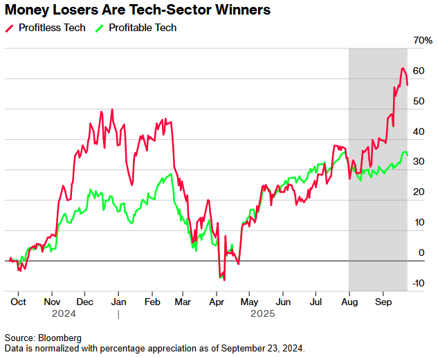 瑞银追踪的一篮子未盈利科技公司股票自7月底以来已上涨21%,同期盈利科技公司股票仅上涨2.1%,纳斯达克100指数上涨5.9%。此轮上涨推动包括SoundHound AI(SOUN.US)和Unity Software(U.US)等在内的一篮子未盈利科技公司股价接近2021年底以来的最高水平——当时正值利率触底,投机性资产泡沫在次年破裂。