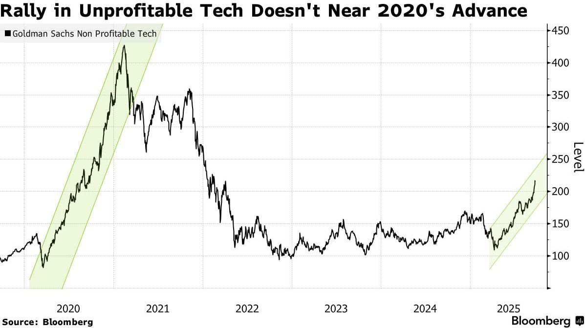 高盛追踪的类似无利可图投资组合较4月低点上涨近一倍,近期创下2022年2月以来最高水平。