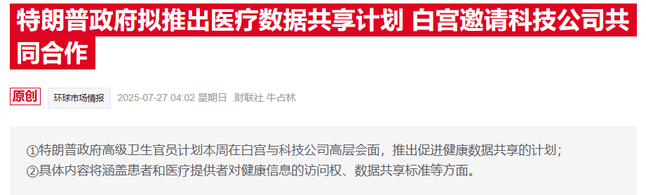 财联社7月31日讯(编辑 赵昊)当地时间周三(7月30日),谷歌、亚马逊、苹果等大型科技公司,以及联合健康、西维斯健康等医保巨头,已同意与美国政府和医疗系统合作,目标是将美国碎片化的医疗数据互通整合。