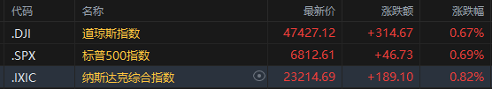 截至收盘,道琼斯指数涨0.67%,报47427.12点;标普500指数涨0.69%,报6812.61点;纳斯达克综合指数涨0.82%,报23214.69点。