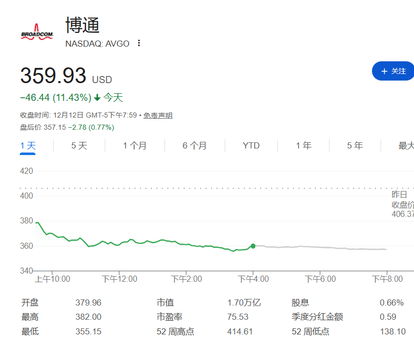 12月12日周五,一股抛售浪潮席卷了与AI相关的股票。博通的股价一度重挫12%,拖累标普500指数和纳斯达克综合指数双双下跌超过1%,完全逆转了本周早些时候因降息预期而创下的历史新高。甲骨文则续跌超4%。