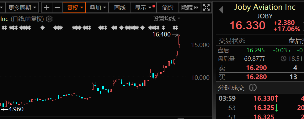 消息发布后,Joby Aviation7月15日大涨10.45%;7月16日,该股继续高开高走,收盘涨幅超17%,本周累计上涨超35%。从4月7日低点以来,Joby Aviation股价累计涨幅超200%,最新总市值近130亿美元。
