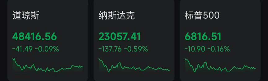 当地时间周一,在科技股的“拖累”下,美股表现平平。截至收盘,美股三大指数集体飘绿。道指跌41.49点,跌幅0.09%,报48416.56点;纳指跌137.76点,跌幅0.59%,报23057.41点;标普500指数跌10.90点,跌幅0.16%,报6816.51点。
