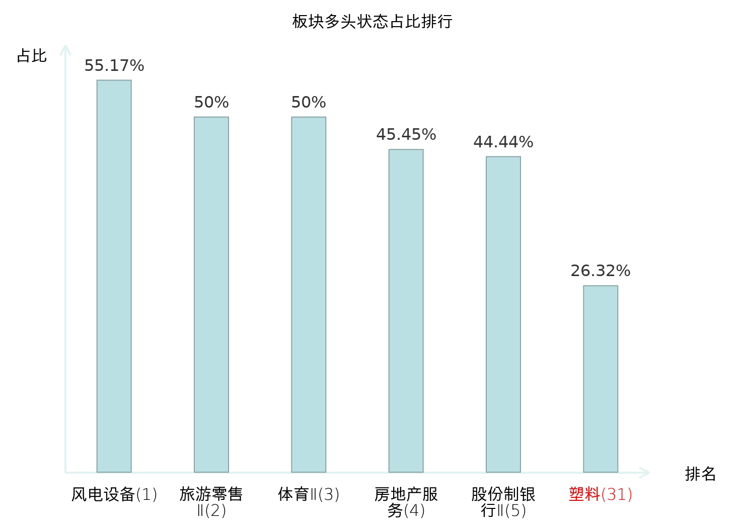 全市场所有行业板块中主力多头状态占比排名中,风电设备板块位居第一。保险Ⅱ板块名次提升最快,较昨日上升64位。