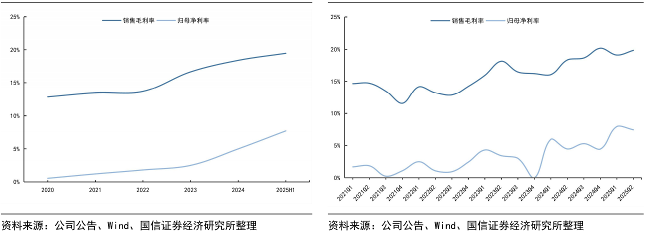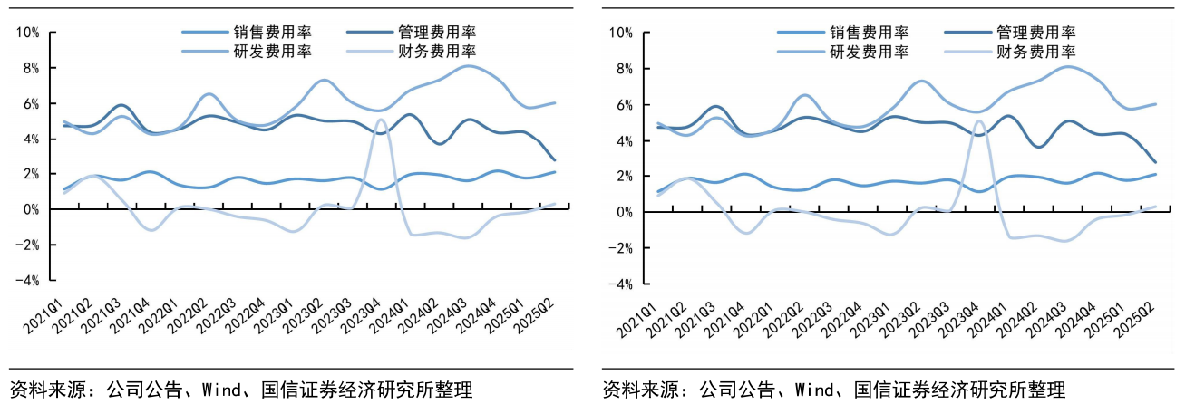 2025Q2公司毛利率为19.84%,同比增长1.49pct,归母净利率7.45%,同比+2.97pct;其中实现销售/管理/研发/财务费用率2.08%/2.76%/6.03%/0.30%,同比分别+0.15/-0.91/-1.29/1.62pct,公司新增吉利、零跑等客户项目终端销量快速增长,公司规模效应加速兑现。