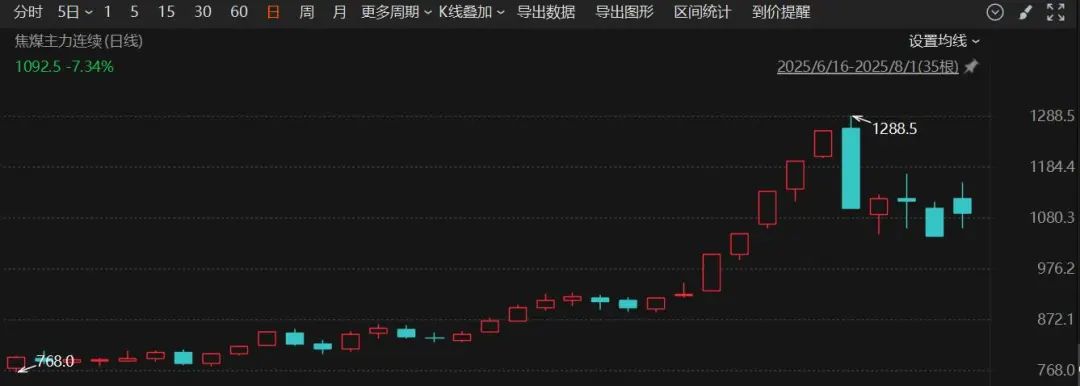 8月首个交易日,焦煤期货主力合约再度报出7.34%的跌幅,周内累计跌幅近20%。此外近一周来,煤焦钢产业链商品主力合约中,焦炭累计跌幅近15%;螺纹钢跌幅超5%;热轧卷板也跌超4%。
