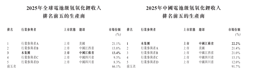 根据弗若斯特沙利文的资料,截至2025年12月31日,全球约有100家电池级氢氧化锂制造商。按2025年全球电池级氢氧化锂收入计,全球前五大制造商合计占比66.1%,公司以13.4%的市场份额位居全球第三。按2025年中国电池级氢氧化锂收入计,中国前五大制造商合计占比91.7%,公司以22.2%的市场份额位居中国第一。