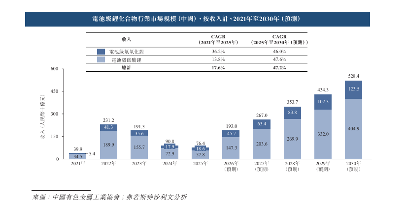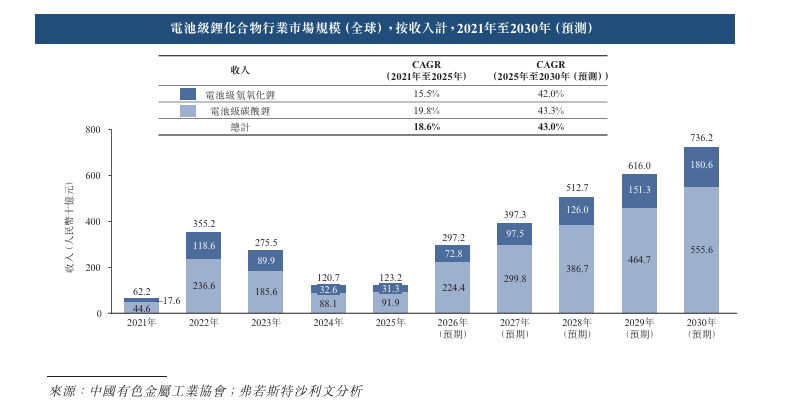 按收入计,全球电池级锂化合物行业的市场规模从2021年的人民币622亿元增长至2025年的人民币1,232亿元,CAGR为18.6%。2025年,按收入计的全球电池级氢氧化锂与全球电池级碳酸锂市场规模分别达到人民币313亿元及人民币919亿元,2021年至2025年的CAGR分别为15.5%和19.8%。