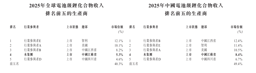 截至2025年12月31日,全球约有200家电池级锂化合物制造商。按2025年全球电池级锂化合物收入计,全球前五大制造商合计占比40.3%,公司以5.3%的市场份额位居全球第四。按2025年中国电池级锂化合物收入计,中国前五大制造商合计占比49.4%,公司以 8.4%的市场份额位居中国第四。