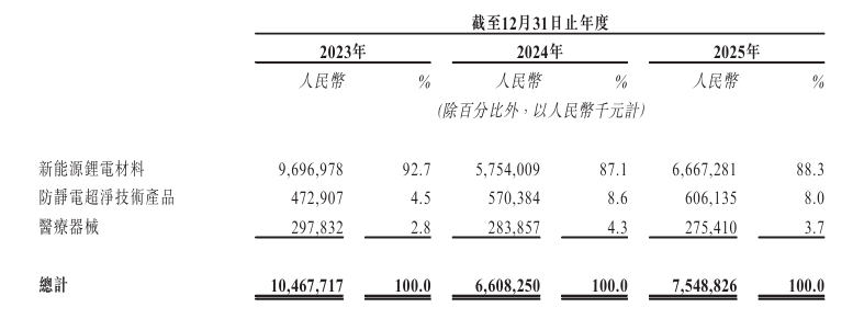 据招股书,天华新能是一家新能源科技企业,主要从事新能源锂电材料的研发、生产及销售。公司业务分为三大业务板块,即新能源锂电材料、防静电超净技术产品及医疗器械。