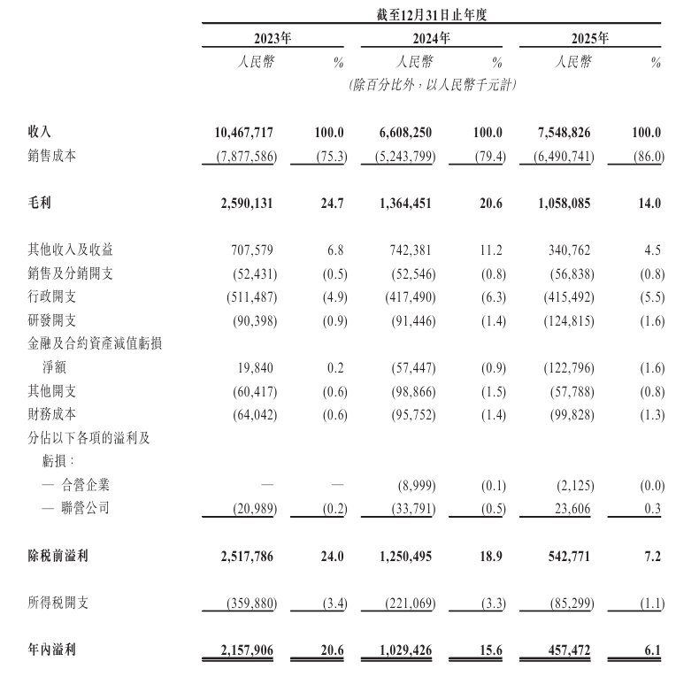 2023年、2024年、2025年,该公司收入分别约为104.68亿元、66.08亿元、75.49亿元人民币。
