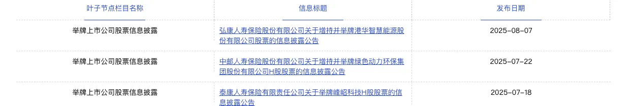 7月18日,泰康人寿以基石投资者身份参与峰岹科技H股IPO,涉资1.79亿元;7月22日,中邮人寿加仓绿色动力环保,触发举牌;8月7日,弘康人寿又再度买入港华智慧能源(01083.HK),持股比例增至5%以上。