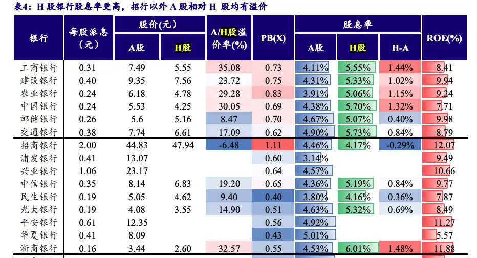 首先,相对于A股,H股银行股息率更高,其中国有行整体在5%以上,对于追求稳定现金流的险资吸引力更大;其次,A/H 两地上市银行中,除招行外A股相对H股均有溢价,四大行溢价率在23%~35%。因此,险资配置港股银行资金成本更低。