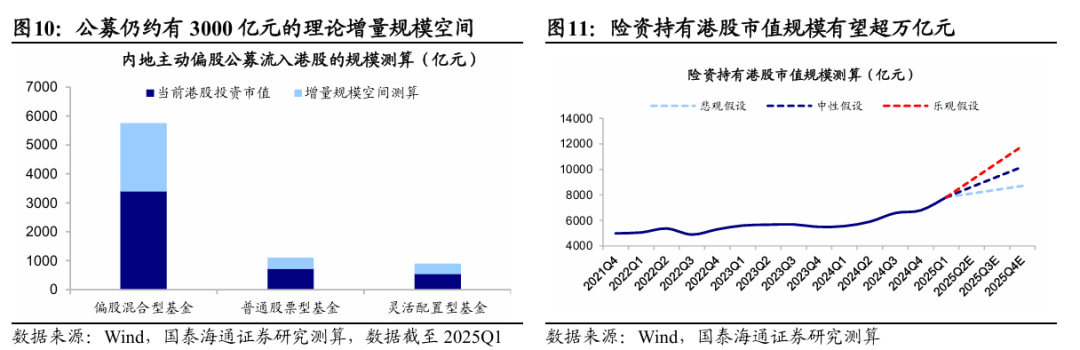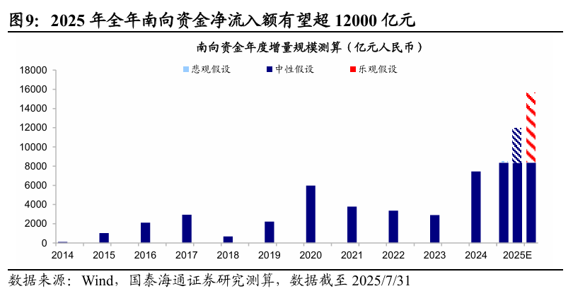 全年南向增量供给望超1.2万亿,下半年港股是增量资金市。该行认为,年内后续港股资金流出项整体压力或相对可控,全年南向净流入规模有望超过1.2万亿元,为港股资金蓄水池提供源源活水。今年以来南向资金持续流入港股,截至25/8/8,南向已累计净流入超8300亿元,超越去年全年流入总额,往后看,以内资机构为代表的南向资金仍有较为可观的增配空间:公募方面,若按港股基金合同规定的港股投资比例上限测算,预计全年公募基金总规模有望达3000-4500亿元;险资方面,受益于保费规模稳步增长,预计全年险资实际增量有望达2500-4000亿元左右。
