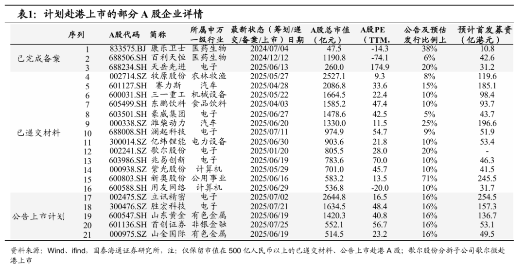 往后看,港股今年后续IPO规模或在1500亿港元。该行分别从港交所IPO申请情况,以及A股赴港上市两个角度分别估算今年后续IPO规模。首先,港交所IPO申请数据显示,目前已获上市委批准的数量为9家,还有207家在审核队列中,参考近五年的平均年通过率(32%)、平均首发募资规模(21.9亿港元)等,预计今年后续IPO融资规模或在1500亿港元左右。其次,当前A股上市公司赴港上市是港股IPO的最主要来源,从此角度测算,目前超80家A股上市公司计划赴港,其中已在港交所完成备案的有3家,已递交材料的有49家。对于已备案/递交材料的企业,根据个股公告的发行比例上限,实际发行比例均值、发行折价均值,得到潜在增量流动性需求约2100亿港元;对于公告上市计划的企业,类似估算的潜在增量流动性需求约1200亿港元。考虑到上市所需时间,预计今年后续A