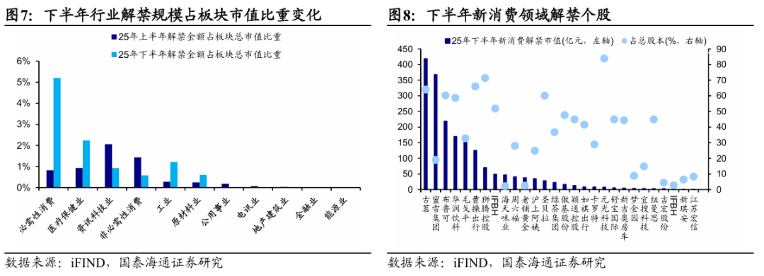 往后看,整体减持压力有限,但高估值且解禁集中的新消费或存在压力。尽管港股解禁潮仍在持续,但解禁压力最大的时刻已过去,25Q3、25Q4港股解禁总额分别占全年总额的17%、31%,明显低于25Q2的50%。从预减持披露看,目前有7家港股公司披露重要股东预减持计划、且尚未实施减持,7月新增披露预减持的公司数量为3家,与前6个月的月均值基本持平。另外,解禁金额并不代表着减持额,二季度整体港股股东并未净减持,或由于港股整体估值水平仍在历史中位水平附近,而市场行情、估值水平是影响股东行为的重要因素。长期看公司估值将回归历史均值水平附近,股东往往在估值较低时增持,在估值过热时减持套现。因此,结合下半年整体解禁压力、目前港股估值水平看,港股后续减持风险或相对可控。