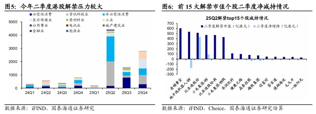 减持:港股二季度解禁高峰已过,后续关注新消费解禁压力。从整体解禁情况看,25Q1港股总解禁额仅为178亿港元,而25Q2是港股限售解禁的高峰期,二季度解禁总金额达4448亿港元,占全年的五成。从股东增减持看,尽管二季度解禁市值大幅增加,但港股股东整体并未净减持,25Q2解禁市值前十大个股整体反而净增持约260亿港元,仅个别热度较高个股出现股东减持行为。