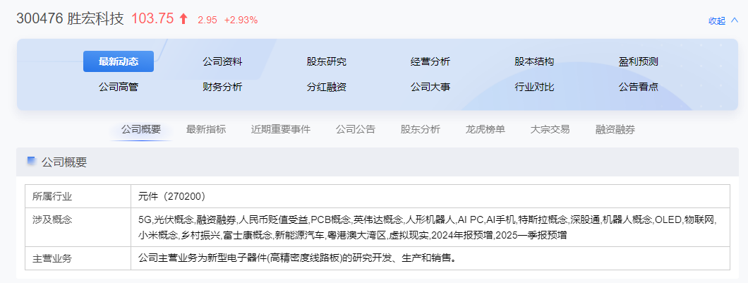 今天为大家带来的是胜宏科技,我们先来了解一下这家公司是做什么的,我们通过公司概要可以清楚的看到:公司所属行业是元件。