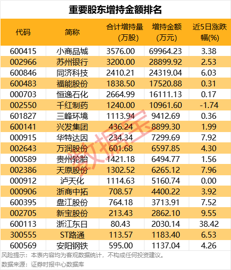 从增持金额看,近5日增持金额在亿元以上的有6股,增持金额最多的是小商品城,其间累计增持3576万股,增持金额合计近7亿元;其次是苏州银行,增持量为3200万股,增持金额2.89亿元;同济科技近5日获股东增持2.43亿元,增持金额位居第三。