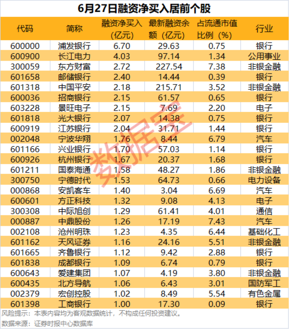 具体到个股,6月27日共有1700只股获融资净买入,净买入金额在千万元以上的有373只,其中26只融资净买入额超亿元。浦发银行融资净买入额居首,当日净买入6.70亿元;其次是长江电力、东方财富,融资净买入金额分别为4.03亿元、2.72亿元;融资净买入金额居前的还有邮储银行、中国平安、招商银行等。