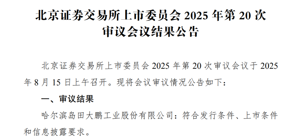 北交所上市委于8月15日举行2025年第20次审议会议,大鹏工业顺利过会。