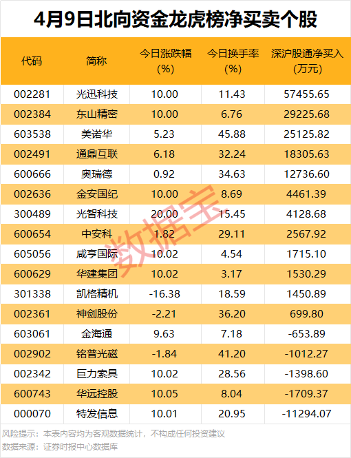 今日龙虎榜现身个股中,12股获北向资金净买入。净买入居首的是光迅科技,金额为5.75亿元;东山精密、美诺华紧随其后,净买入金额均超2亿元。