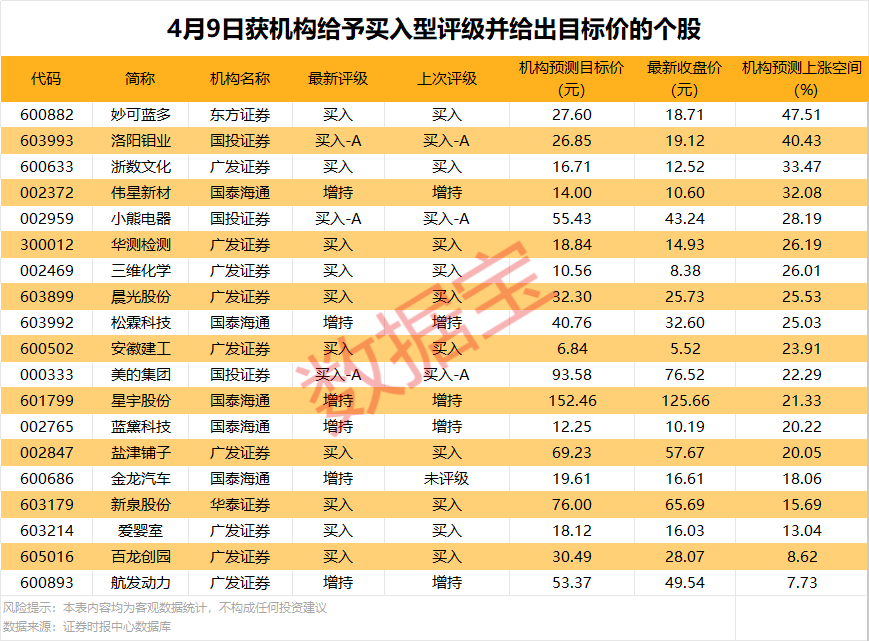 今日获机构买入型评级个股中,共有19条评级记录中对相关个股给出了预测目标价。以公布的预测目标价与最新收盘价进行对比显示,共有14股上涨空间超20%,妙可蓝多上涨空间最高,4月9日东方证券预计公司目标价为27.60元/股,上涨空间达47.51%;上涨空间较高的个股还有洛阳钼业、浙数文化等,上涨空间分别为40.43%、33.47%。