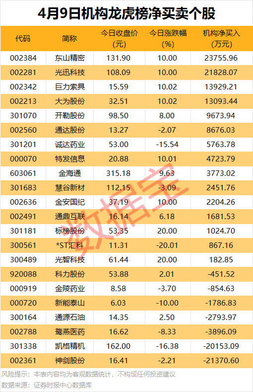 今日龙虎榜中,机构净买入个股有15只,净卖出的个股为7只。机构净买入7股均超5000万元,东山精密获机构净买入2.38亿元,居首;其次是光迅科技、巨力索具、大为股份,机构净买入金额分别为2.18亿元、1.39亿元、1.31亿元。