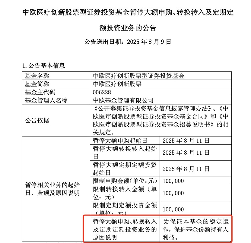 8月9日,中欧基金称,为进一步保证基金稳定运作,保护基金份额持有人利益,葛兰管理的中欧医疗创新单日单账户限购10万元。