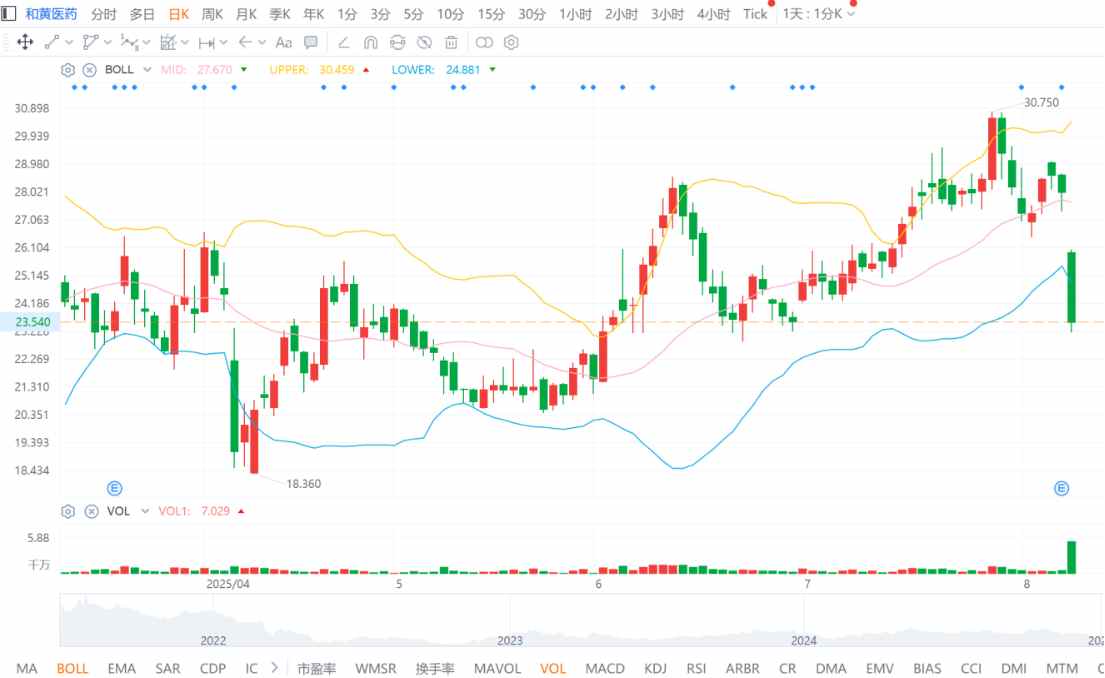 自今年4月7日受外部因素及恒指大盘震荡影响,股价暴跌22.12%后,和黄医药(00013)股价开启了一段波动拉升行情,并最终在7月29日盘中触及30.75港元,刷新了今年以来的股价新高。