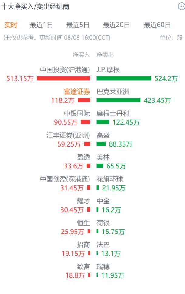 从经纪商交易席位能够明显看出内外资对和黄医药的态度差异。实时数据显示,当日,中国投资、富途证券和中银国际为和黄医药的买方前三席,分别净买入513.15万股、118.20万股和90.55万股;而JP摩根、巴克莱亚洲和摩根士丹利为卖方前三席,分别净卖出524.20万股、423.45万股和122.45万股。