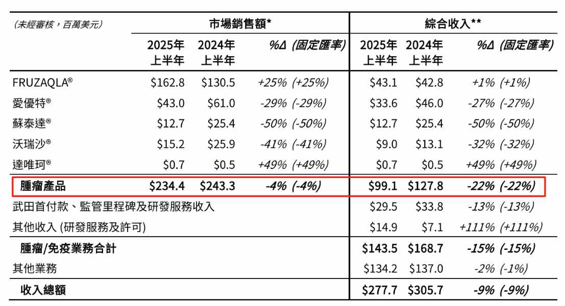 也就是说,目前创新药需要撑起和黄医药后续的业绩增长。但今年上半年,公司三大主力药物的国内销售额却全线下滑。其中,爱优特®(ELUNATE®,呋喹替尼)收入降至4300万美元(同比下滑29%),原因在于结直肠癌三线治疗领域竞争加剧苏泰达®(SULANDA®,索凡替尼)收入降至1270万美元(同比下滑50%),原因在于受生长抑素类似物药物冲击;而沃瑞沙®(ORPATHYS®,赛沃替尼)收入降至1520万美元(同比下滑41%),原因在于其受竞品纳入医保影响。