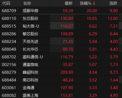 上证报中国证券网讯 9月3日早盘,半导体板块震荡回升,截至10时43分,成都华微20cm涨停,东芯股份涨超10%,裕太微、敏芯股份、天岳先进、长光华芯等涨超5%。