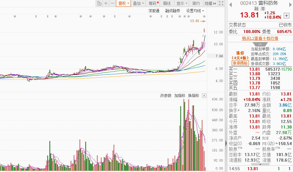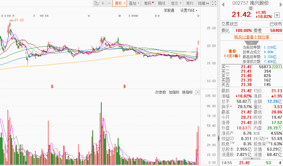 市场情绪:今日市场高开高走收复4000点,热点全面开花,市场情绪躁动,成交额放大至2.55万亿,全市场共108股涨停,连板股总数14只,26股封板未遂,封板率为80%(不含ST股、退市股)。焦点股方面,实控人变更的锋龙股份7连板、友邦吊顶3连板,洁净室概念股圣晖集成9天5板,商业航天概念股雷科防务4连板,AI应用板块南兴股份3连板。