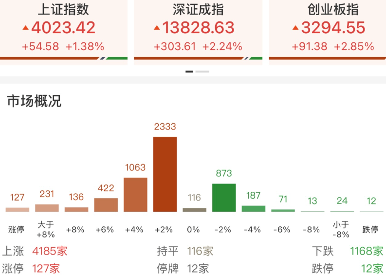市场高开高走迎来2026年开门红,创业板指领涨,沪指重回4000点上方,录得十二连阳。沪深两市成交额高达2.55万亿,较上一个交易日放量5011亿。盘面上,脑机接口、商业航天等热点全面开花,全市场超4100只个股上涨,其中127只个股涨停。脑机接口概念全天领涨,三十余只成分股涨停,半导体产业链走强,亚翔集成、圣晖集成等多股涨停。AI应用概念表现活跃,蓝色光标2连板。下跌方面,海南自贸概念集体大跌,海南发展跌停。截至收盘,沪指涨1.38%,深成指涨2.24%,创业板指涨2.85%。