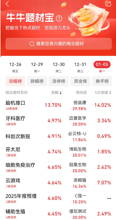 “牛牛题材宝”是一款秉持着自上而下选股逻辑的辅助决策工具。它通过大量的数据汇总和统计,为用户做出自上而下的选股决策提供参考,帮助用户把握当下行情中的热点题材板块,以及板块中的强势龙头股。