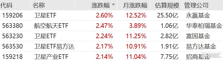 盘面上,卫星ETF、航空航天ETF、卫星ETF易方达、卫星产业ETF涨超2%。