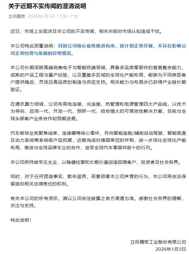 立讯精密澄清OpenAI硬件代工传闻:核心业务按计划正常开展